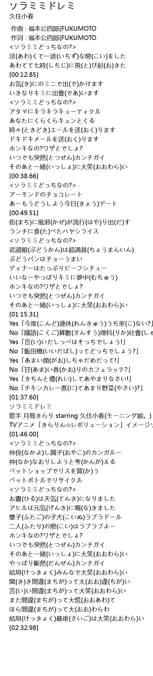 | [02:19.80] | 聞(き)き間違(まちが)って大(おお)違(ちが)い |