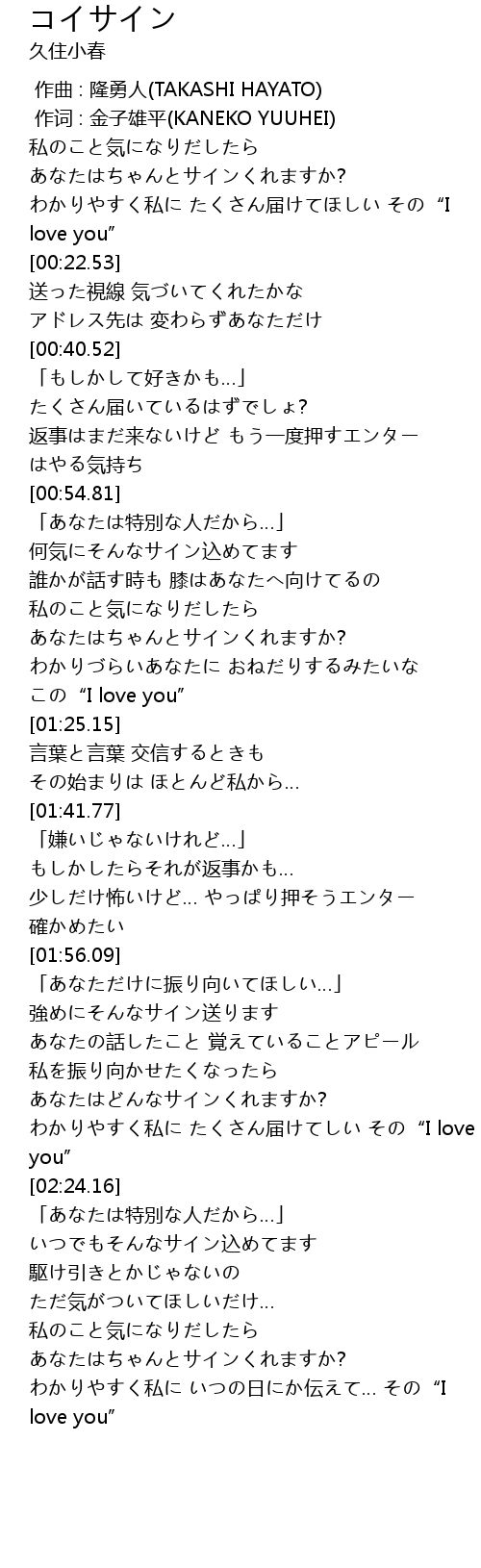 | [02:14.73] | わかりやすく私に たくさん届けてしい その“I love you” |