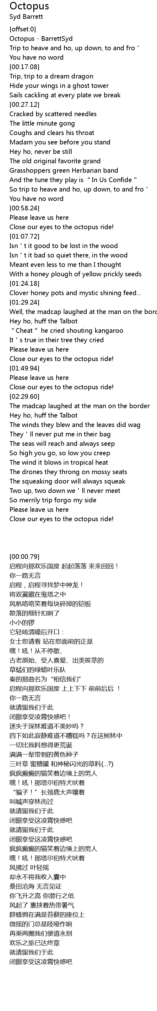 | [02:23.86] | Close our eyes to the octopus ride! |