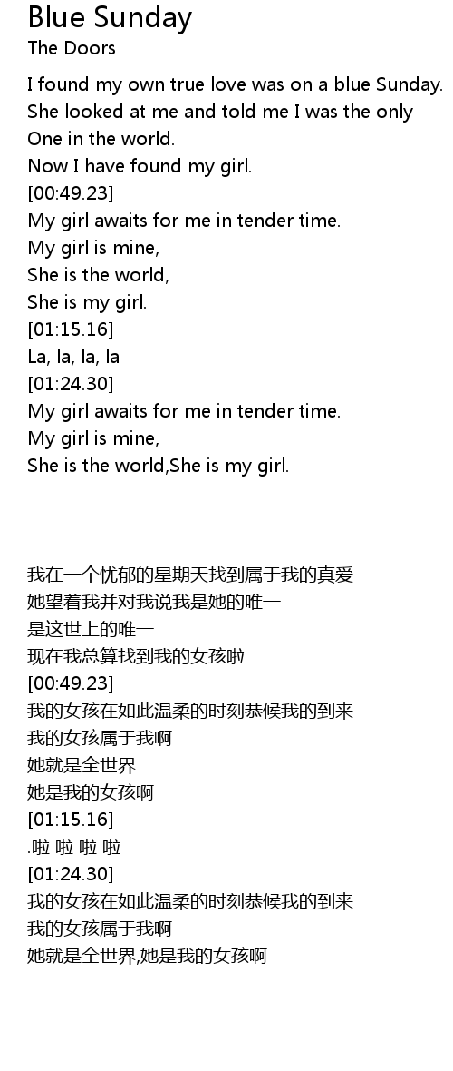 | [00:19.40] | I found my own true love was on a blue Sunday. |