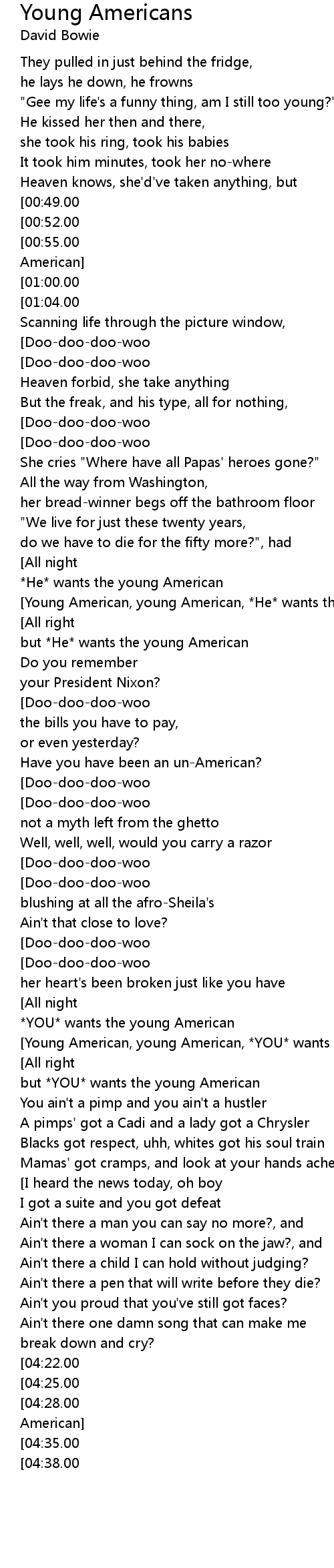 | [02:03.00][Young American, young American, *He* wants the young American] |