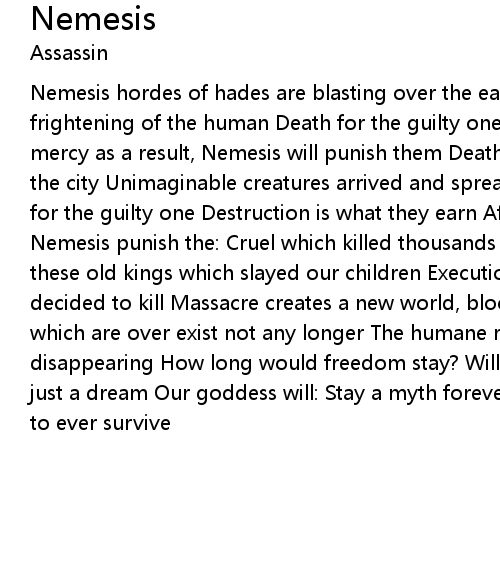 Nemesis hordes of hades are blasting over the earth Saveness diapering frightening of the human Death for the guilty one, no hope is given to them No mercy as a result, Nemesis will punish them Deathly breeze of wind plunging into the city Unimaginable creatures arrived and spread Out into their streets Pain for the guilty one Destruction is what they earn After ruling a period of time, Nemesis punish the: Cruel which killed thousands of innocent lifes Death to these old kings which slayed our children Execution has begun, the goddess decided to kill Massacre creates a new world, blood has to be spoile The horrors which are over exist not any longer The humane race is saved, Nemesis disappearing How long would freedom stay? Will Nemesis save us again or was it just a dream Our goddess will: Stay a myth forever remembered We need her help to ever survive