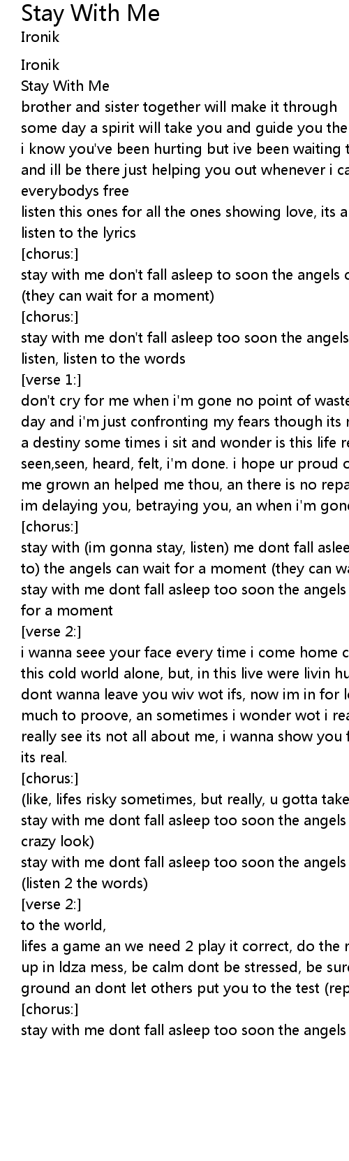 stay with (im gonna stay, listen) me dont fall asleep too soon (im gonna try not to) the angels can wait for a moment (they can wait man, i swear) |