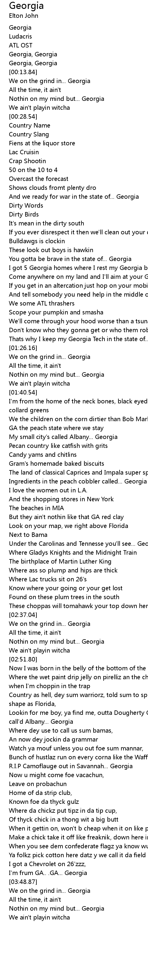 [03:01.32] Lookin for me boy, ya find me, outta Dougherty County in a small city call'd Albany... Georgia