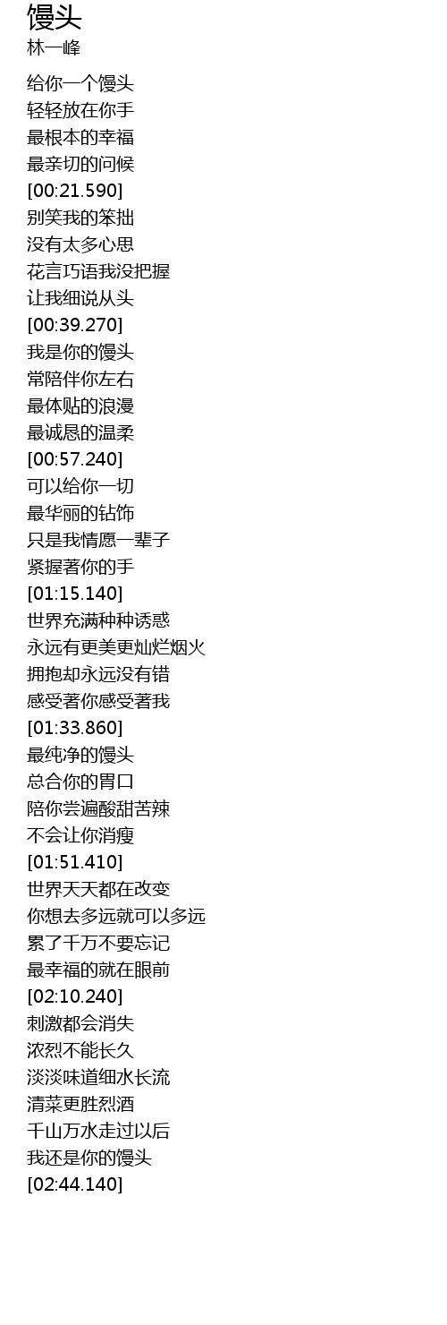 | [02:37.900] | wǒ hái shì nǐ de mán tou |