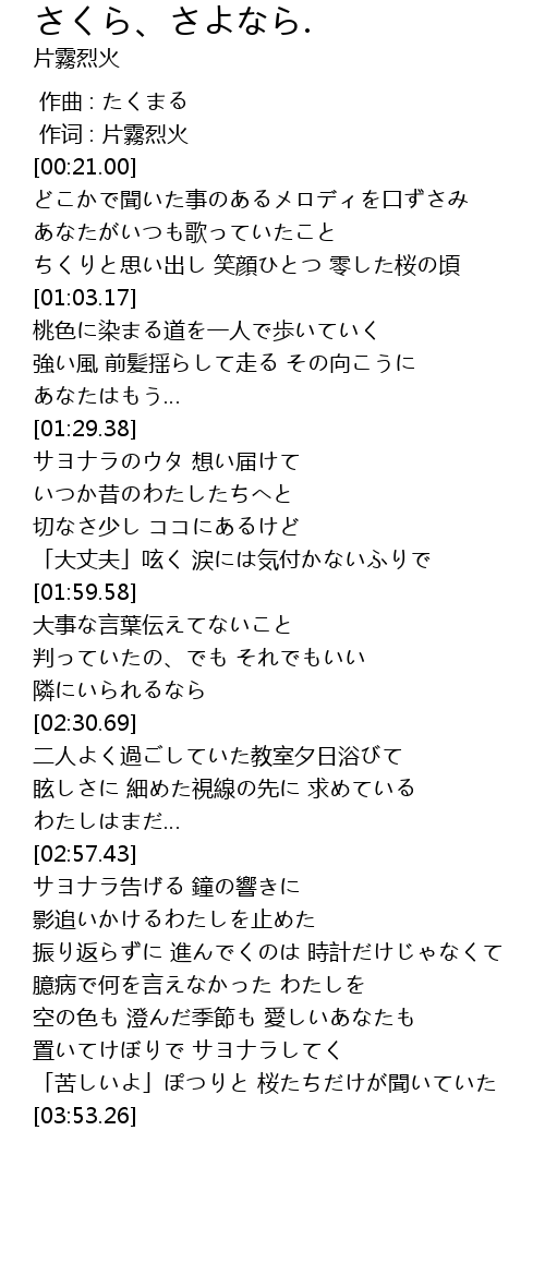 | [03:42.96] | 「苦しいよ」ぽつりと 桜たちだけが聞いていた |