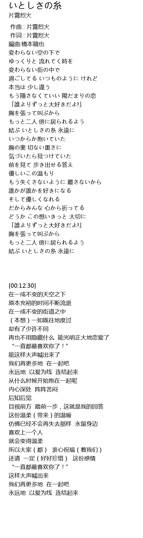 | [03:51.37] | 結ぶ いとしさの糸 永遠に |