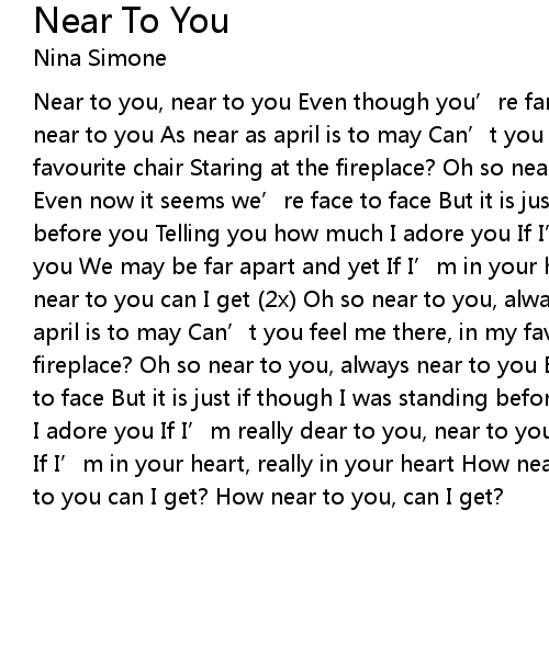| Near to you, near to you Even though you' re far away So near to you, always near to you As near as april is to may Can' t you feel me there, in my favourite chair Staring at the fireplace? Oh so near to you, always near to you Even now it seems we' re face to face But it is just if though I was standing before you Telling you how much I adore you If I' m really dear to you, near to you We may be far apart and yet If I' m in your heart, really in your heart How near to you can I get 2x Oh so near to you, always near to you As near as april is to may Can' t you feel me there, in my favourite chair Staring at the fireplace? Oh so near to you, always near to you Even now it seems we' re face to face But it is just if though I was standing before you Telling you how much I adore you If I' m really dear to you, near to you We may be far apart and yet If I' m in your heart, really in your heart How near to you can I get? How near to you can I get? How near to you, can I get? |