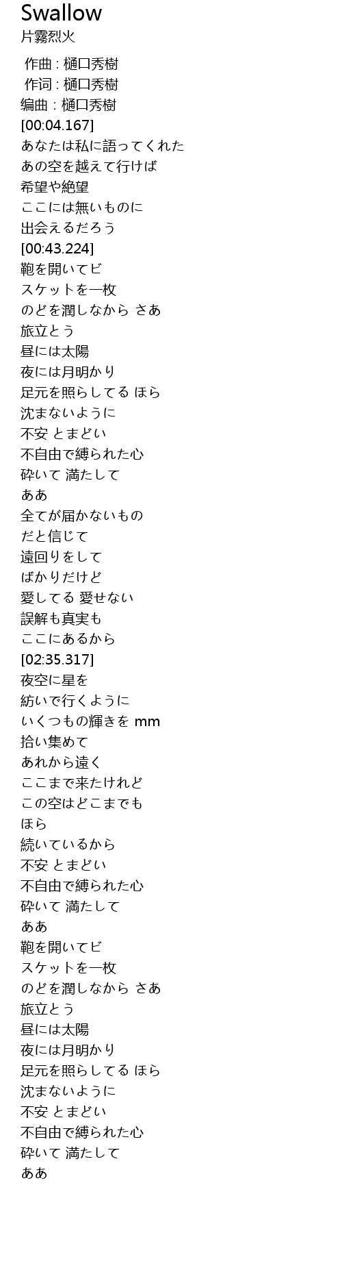 | [00:00.322] | 作词 : 樋口秀樹 |