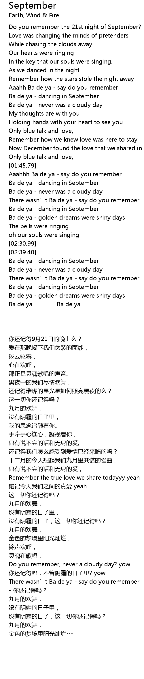 | [02:41.39] | Ba de ya dancing in September |