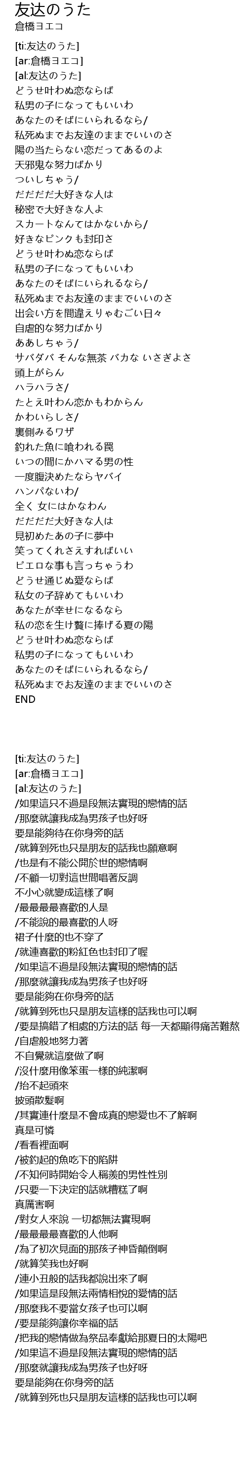 | [00:25.32] | 私死ぬまでお友達のままでいいのさ |