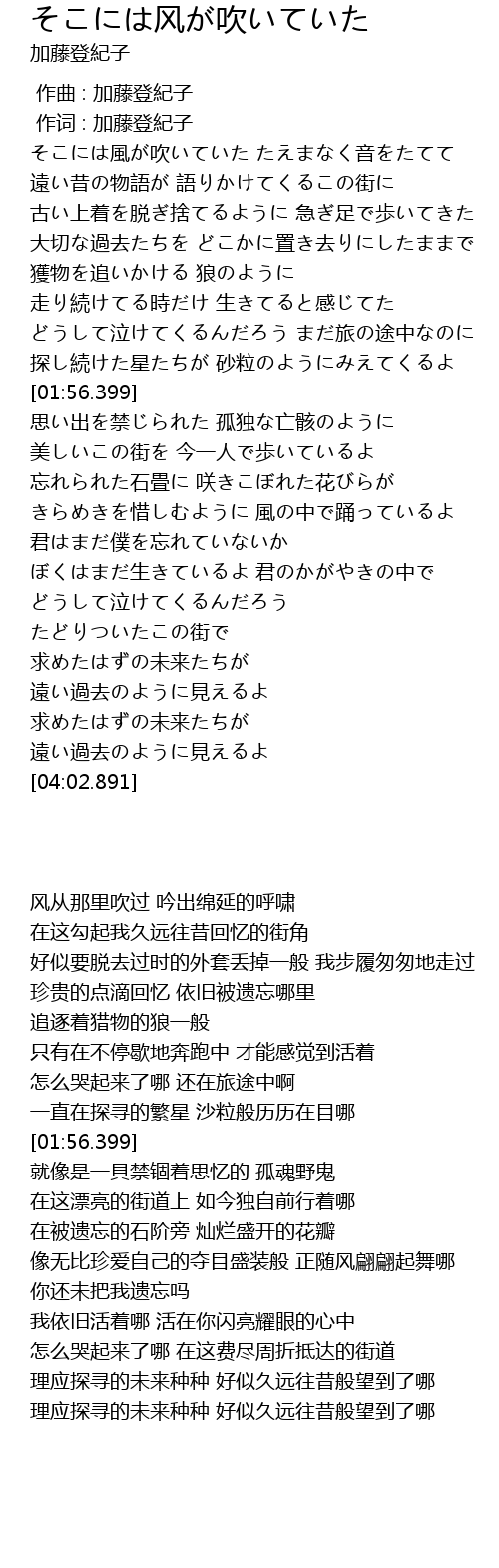| [00:23.311] | そこには風が吹いていた たえまなく音をたてて |