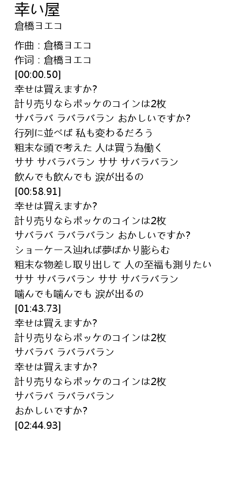 | [01:01.00] | 幸せは買えますか? 計り売りならポッケのコインは2枚 |