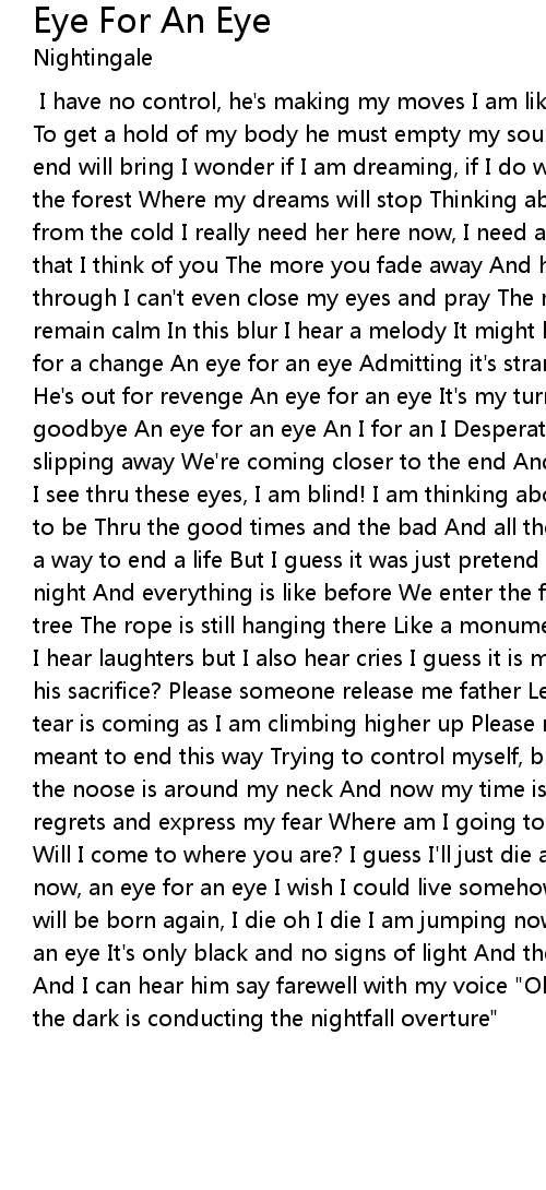 [ Swano ] I have no control, he's making my moves I am like a puppet on a string To get a hold of my body he must empty my soul But right now I wonder what the end will bring I wonder if I am dreaming, if I do will I wake up Before we reach the forest Where my dreams will stop Thinking about the woman That has saved me from the cold I really need her here now, I need a hand to hold And the more that I think of you The more you fade away And here in this hell that I am going through I can't even close my eyes and pray The noise drives me crazy But I remain calm In this blur I hear a melody It might be the final psalm It's time for a change An eye for an eye Admitting it's strange He'll live and I'll die He's out for revenge An eye for an eye It's my turn to suffer now The final goodbye An eye for an eye An I for an I Desperation takes control My life is slipping away We're coming closer to the end And there is nothing that I can do I see thru these eyes, I am blind! I am thinking about my life the way it used to be Thru the good times and the bad And all the moments that I've had It's not a way to end a life But I guess it was just pretend I am out walking this winter night And everything is like before We enter the forest now and I can see the tree The rope is still hanging there Like a monument to forever be In the noise I hear laughters but I also hear cries I guess it is my soul I hear Knowing of his sacrifice? Please someone release me father Let this torture stop I feel a tear is coming as I am climbing higher up Please my friend forgive me I wasn't meant to end this way Trying to control myself, but I am the game you play And the noose is around my neck And now my time is here I wish I could show my regrets and express my fear Where am I going to can you tell me what we'll be Will I come to where you are? I guess I'll just die and see! The gallow is ready now, an eye for an eye I wish I could live somehow, but lifeless I'll lie And he will be born again, I die oh I die I am jumping now I am losing life an eye for an eye It's only black and no signs of light And the shadow has entered my body And I can hear him say farewell with my voice "Oh, when the night comes down And the dark is conducting the nightfall overture" |
