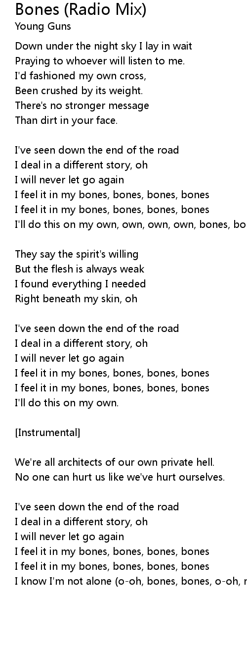 I'll do this on my own, own, own, own, bones, bones, o-oh |
