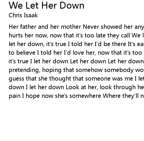 Her father and her mother Never showed her any affection at all I wonder if it hurts her now, now that it's too late they call We let her down, it's true We let her down, it's true I told her I'd be there It's easy to say what you want to believe I told her I'd love her, now that it's too late I see I let her down, it's true I let her down Let her down Let her down I let her down So helpless, pretending, hoping that somehow somebody would see So desperate for someone, I guess that she thought that someone was me I let her down, it's true I let her down I let her down Look at her, look through her eyes Closer the hurt and the pain I hope now she's somewhere Where they'll never hurt her again |