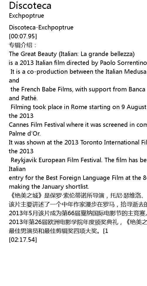 | [00:20.27] | The Great Beauty Italian: La grande bellezza |