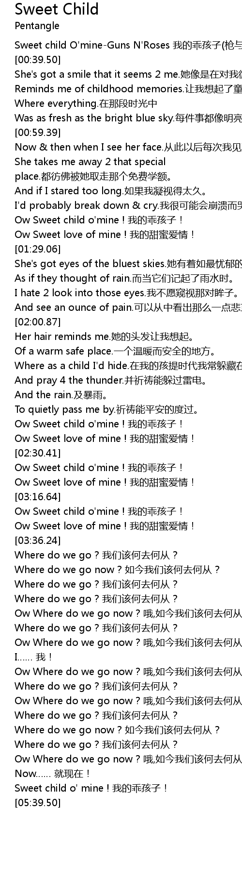 | [03:01.02] | Ow Sweet child o' mine ! wǒ de guāi hái zi! |