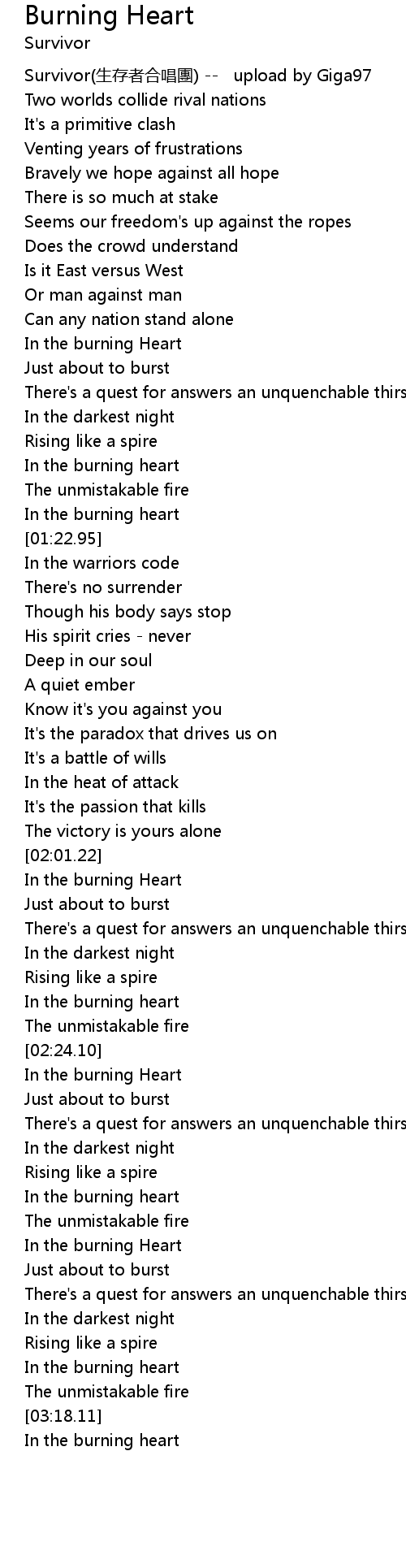 | [00:00.00] | Survivor(生存者合唱團) -- upload by Giga97 |