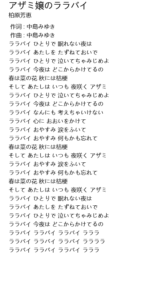 | [00:24.370] | ララバイ あたしを たずねておいで |