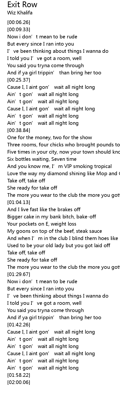 | [01:42.44] | Cause I, I aint gon' wait all night long |