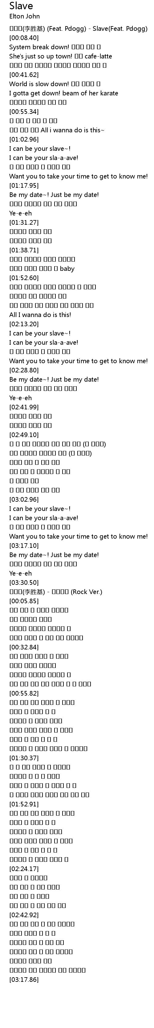 | [00:00.44] | 이승기(李胜基) (Feat. Pdogg) - Slave(Feat. Pdogg) |