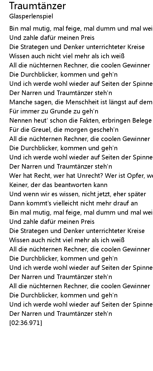 | [00:35.423] | Der Narren und Traumtänzer steh'n |