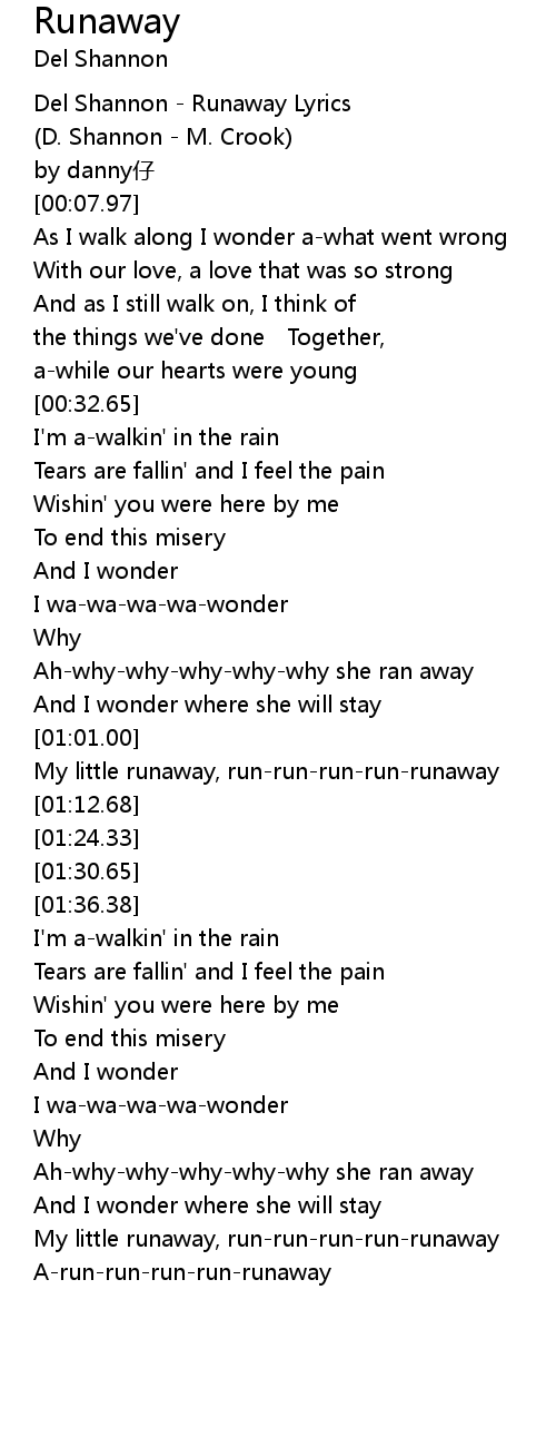 | [00:03.38] | Del Shannon - Runaway Lyrics |