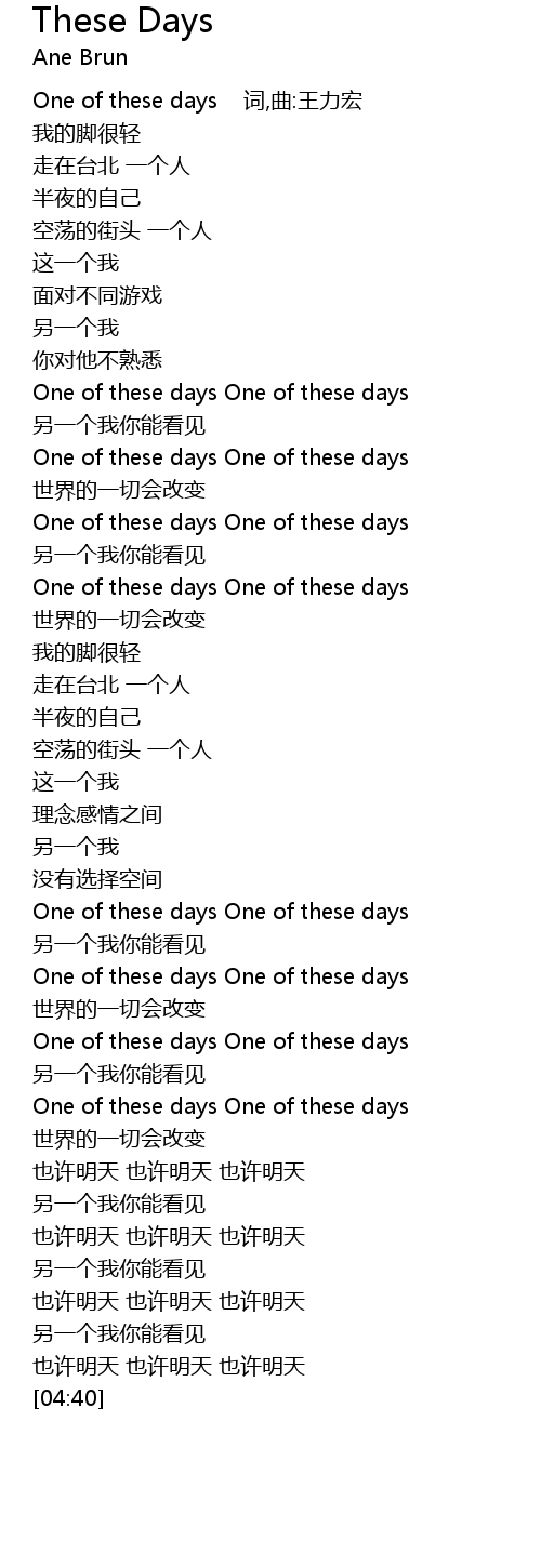 | [00:00] | One of these days 词,曲:王力宏 |