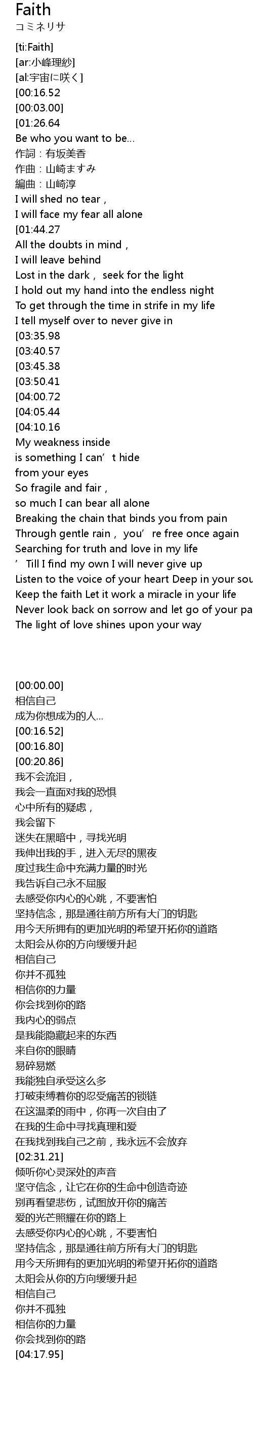 | [00:00.00][00:16.52][02:31.21][04:17.95] | 小峰理紗-Faith |