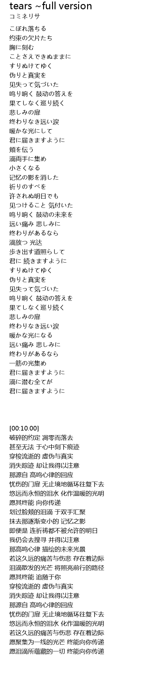 | [01:09.13] | 悠远而永恒的泪水 化作温暖的光明 |