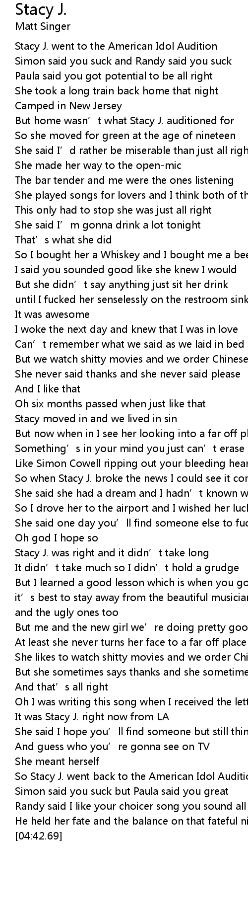 | [00:08.34] | Stacy J. went to the American Idol Audition |