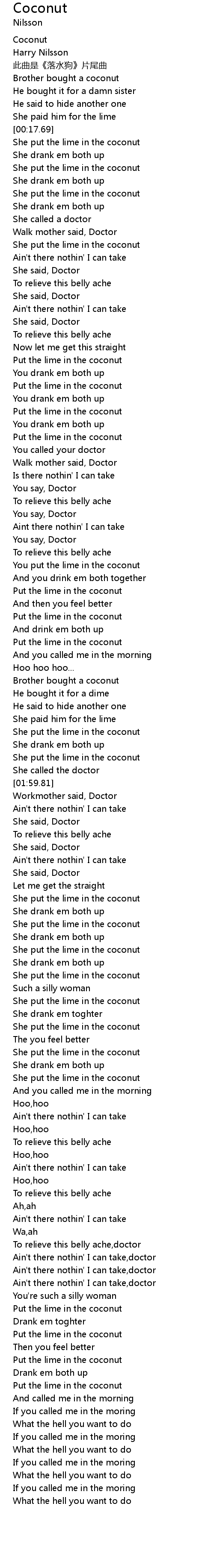 | [02:17.01] | She put the lime in the coconut |