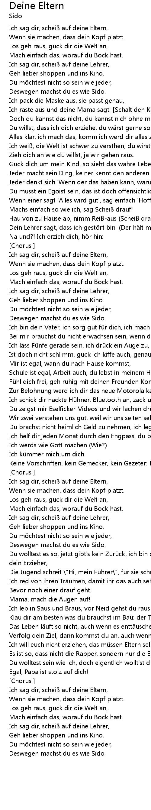 | Ich sag dir, scheiß auf deine Eltern, | |