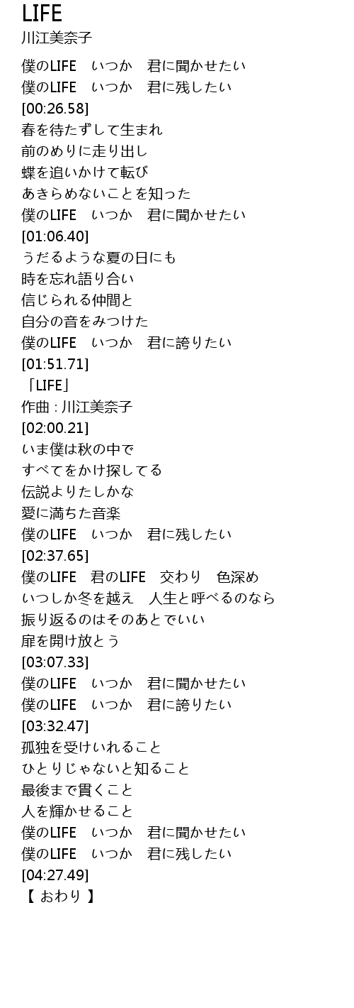 | [04:13.71] | 僕のLIFE いつか 君に残したい |