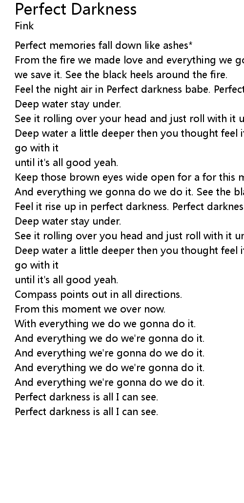 Feel the night air in Perfect darkness babe. Perfect darkness is all i can see. |