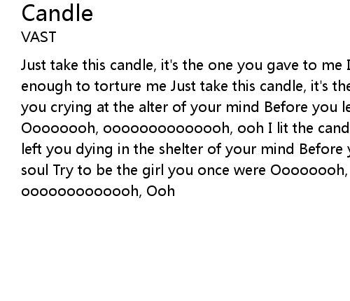 | Just take this candle, it's the one you gave to me It has enough light, just enough to torture me Just take this candle, it's the one you gave to me I left you crying at the alter of your mind Before you let the world mess up your soul Oooooooh, oooooooooooooh, ooh I lit the candle used to light your hair on fire I left you dying in the shelter of your mind Before you let the world mess up your soul Try to be the girl you once were Oooooooh, ooooooooooooh Oooooooh, ooooooooooooh, Ooh |