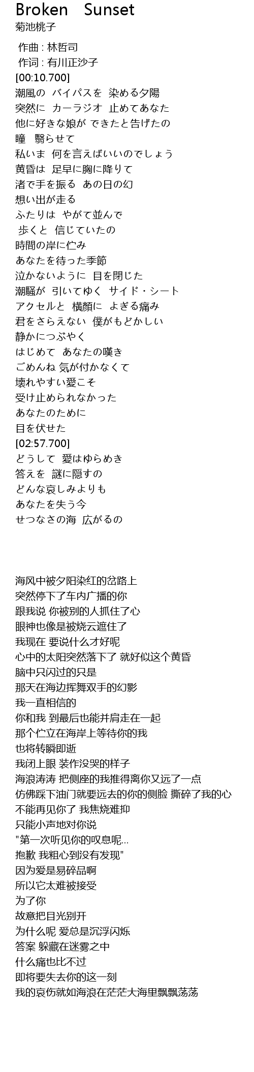 | [00:24.700] | 潮風の バイパスを 染める夕陽 |