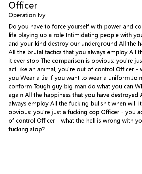 Do you have to force yourself with power and control Do feel a need to live your life playing up a role Intimidating people with your wall of sight and sound You and your kind destroy our underground All the happiness that you have destroyed All the brutal tactics that you always employ All the fucking bullshit when will it ever stop The comparison is obvious: you're just a fucking cop Officer - you act like an animal, you're out of control Officer - what the hell is wrong with you Wear a tie if you want to wear a uniform Join the army if you want to conform Tough guy big man do what you can Whatever you destroy we'll create it again All the happiness that you have destroyed All the brutal tactics that you always employ All the fucking bullshit when will it ever stop The comparison is obvious: you're just a fucking cop Officer - you act like an animal, you're out of control Officer - what the hell is wrong with you Officer Why don't you fucking stop? |