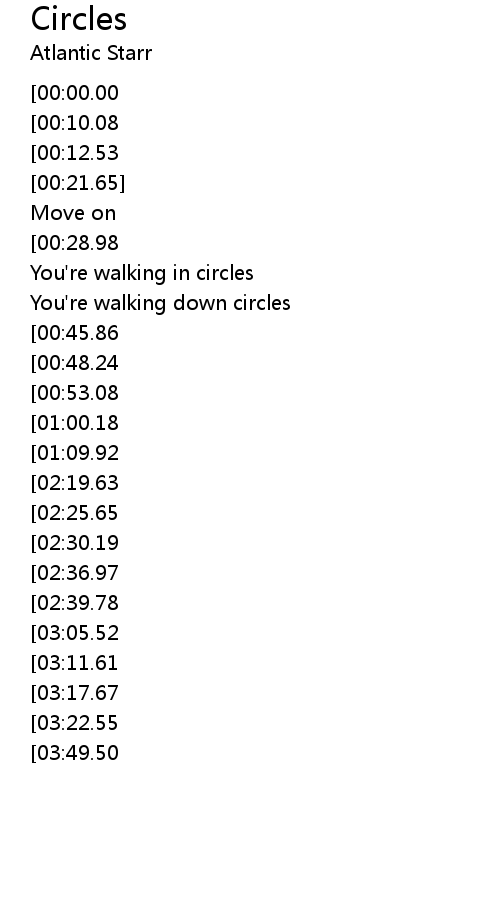 | [02:06.66][01:00.18] | You' re walking in tiny circles |