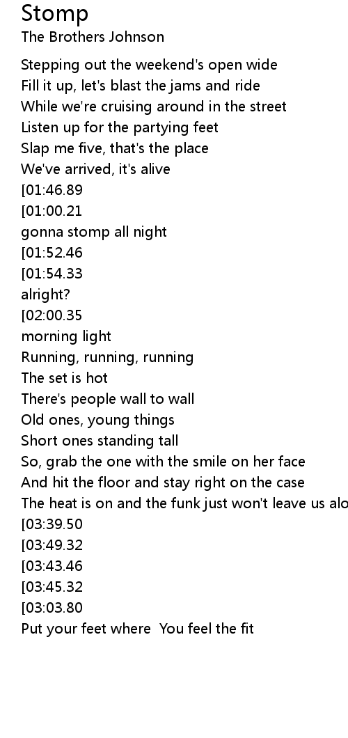 [00:52.40][01:00.21][01:48.39][01:56.49][02:04.99][02:12.86][02:52.83][03:10.79][03:18.89][03:26.88] We're gonna stomp all night