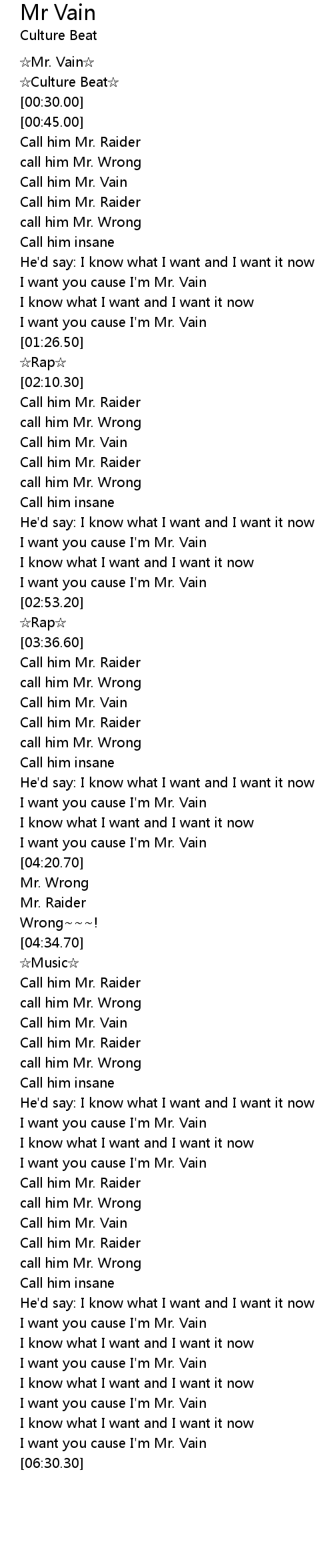 | [06:26.30] | I want you cause I' m Mr. Vain |