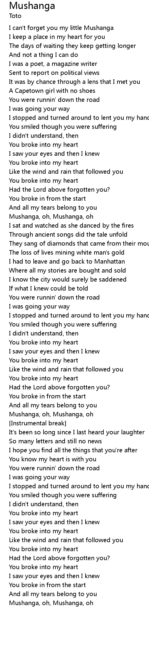 Mushanga, oh, Mushanga, oh |