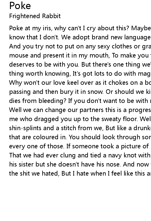 Poke at my iris, why can't I cry about this? Maybe there is something that you know that I don't. We adopt brand new language, communicate through pursed lips, And you try not to put on any sexy clothes or graces. I might never catch a mouse and present it in my mouth, To make you feel you're with someone who deserves to be with you. But there's one thing we've got going and it's the only thing worth knowing, It's got lots to do with magnets and the pull of the moon. Why won't our love keel over as it chokes on a bone? And we can mourn its passing and then bury it in snow. Or should we kick its cunt in and watch as it dies from bleeding? If you don't want to be with me just say and I will go. Oooh Well we can change our partners this is a progressive dance but Remember it was me who dragged you up to the sweaty floor. Well this has been a reel I've got shin-splints and a stitch from we, But like a drunken night it's the best bits that are coloured in. You should look through some old photos, I adored you in every one of those. If someone took a picture of us now they'd need to be told, That we had ever clung and tied a navy knot with arms at night. I'd say she was his sister but she doesn't have his nose. And now we're unrelated and rid of all the shit we hated, But I hate when I feel like this and I never hated you. Oooh |