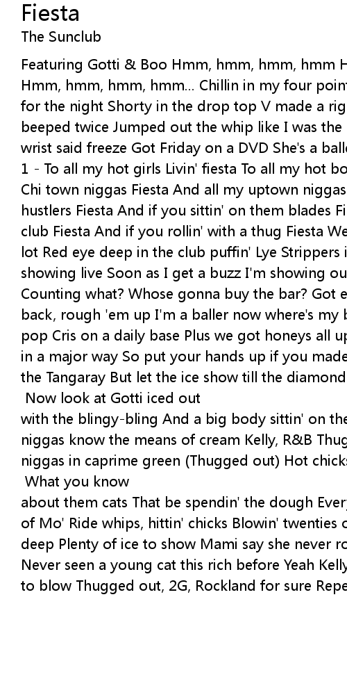 Featuring Gotti & Boo Hmm, hmm, hmm, hmm Hmm, hmm, hmm, hmm Hmm, hmm, hmm, hmm Hmm, hmm, hmm, hmm... Chillin in my four point six at the light Bout to be VIP for the night Shorty in the drop top V made a right Pull up to her bumper baby, beeped twice Jumped out the whip like I was the police Didn't have a gun, but my wrist said freeze Got Friday on a DVD She's a baller and I'm a baller Wha-what? 1 - To all my hot girls Livin' fiesta To all my hot boys Livin' fiesta To all my Chi town niggas Fiesta And all my uptown niggas Fiesta To all my players and my hustlers Fiesta And if you sittin' on them blades Fiesta To all my honeys in the club Fiesta And if you rollin' with a thug Fiesta We be off in the club sippin lot Red eye deep in the club puffin' Lye Strippers in the back of the club showing live Soon as I get a buzz I'm showing out House on top of the hill Counting what? Whose gonna buy the bar? Got enough Take the haters out in the back, rough 'em up I'm a baller now where's my ballers? Wha-what? Repeat 1 We pop Cris on a daily base Plus we got honeys all up in the place Bout to wild out in a major way So put your hands up if you made your pay Add a little juice to the Tangaray But let the ice show till the diamond fades Rockland sittin' on Capitol Hill Trackmaster make capital deals [Gotti] Now look at Gotti iced out with the blingy-bling And a big body sittin' on them gleamy things Now Rockland niggas know the means of cream Kelly, R&B Thug and it sings to king Got PJ niggas in caprime green (Thugged out) Hot chicks down to do anything Cop them mo chicks Cop mo bricks, pop mo Cris Ay Kelly drop mo hits [Boo] What you know about them cats That be spendin' the dough Every day drink Henney and a bottle of Mo' Ride whips, hittin' chicks Blowin' twenties on drough To the club thirty deep Plenty of ice to show Mami say she never rolled in a six before (Fiesta) Never seen a young cat this rich before Yeah Kelly made the way for these niggas to blow Thugged out, 2G, Rockland for sure Repeat 1 |