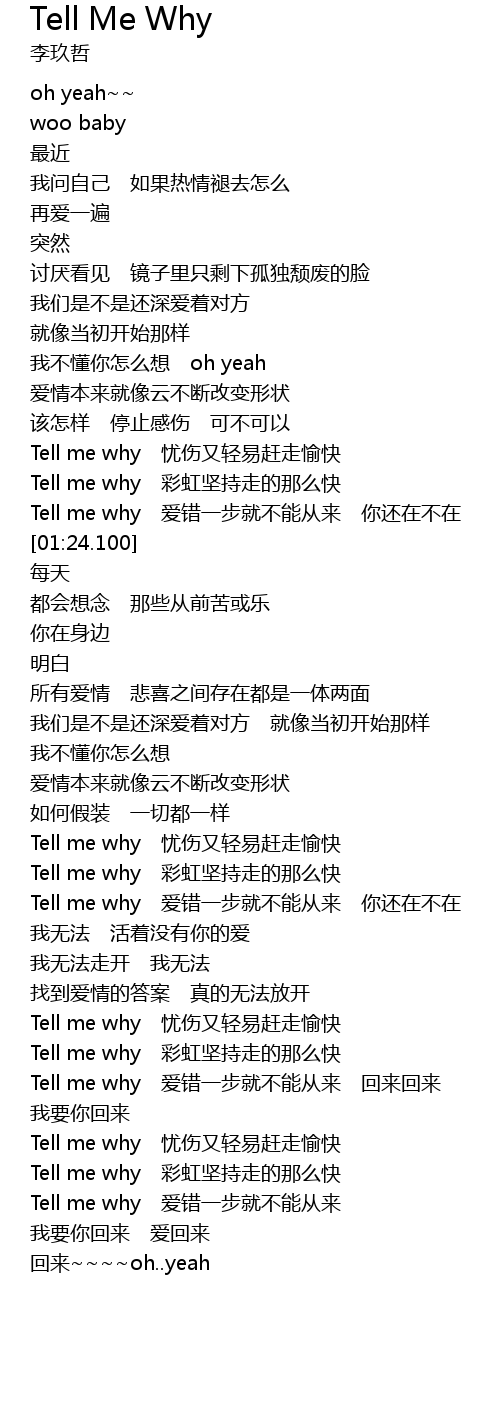| [01:13.450] | Tell me why ài cuò yī bù jiù bù néng cóng lái nǐ hái zài bù zài |