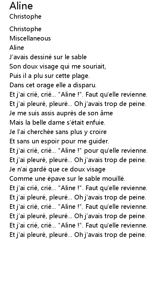 | Et j' ai crie, crie... " Aline !" pour qu' elle revienne. | |