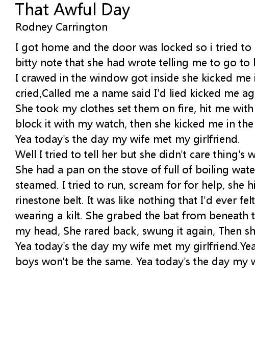 Yea today's the day my wife met my girlfriend.Yea today's that awful day,And my boys won't be the same. Yea today's the day my wife met my girlfriend. |