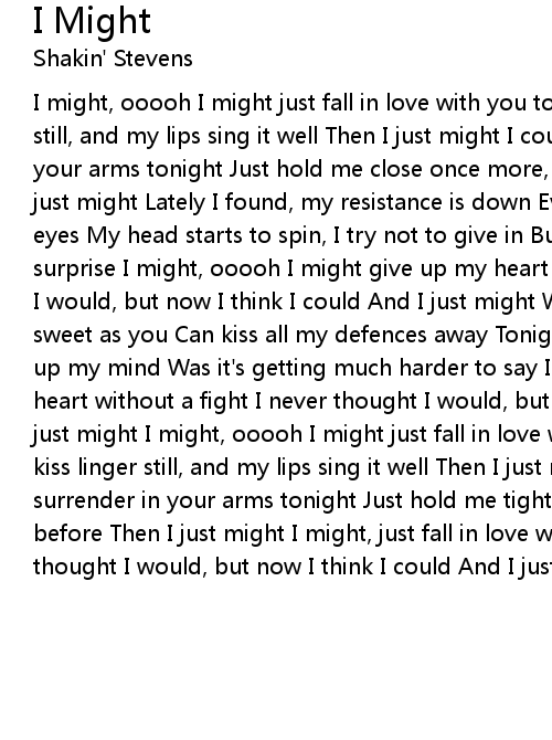 I might, ooooh I might just fall in love with you tonight If your kiss linger still, and my lips sing it well Then I just might I could, I could surrender in your arms tonight Just hold me close once more, and kiss me like before Then I just might Lately I found, my resistance is down Everytime when I look in your eyes My head starts to spin, I try not to give in But if you catch my heart by surprise I might, ooooh I might give up my heart without a fight I never thought I would, but now I think I could And I just might What can I do, when a girl sweet as you Can kiss all my defences away Tonight you may find, that you made up my mind Was it's getting much harder to say I might, ooooh I might give up my heart without a fight I never thought I would, but now I think I could And I just might I might, ooooh I might just fall in love with you tonight If your kiss linger still, and my lips sing it well Then I just might I could, I could surrender in your arms tonight Just hold me tight once more, and kiss me like before Then I just might I might, just fall in love with you tonight I never thought I would, but now I think I could And I just might |