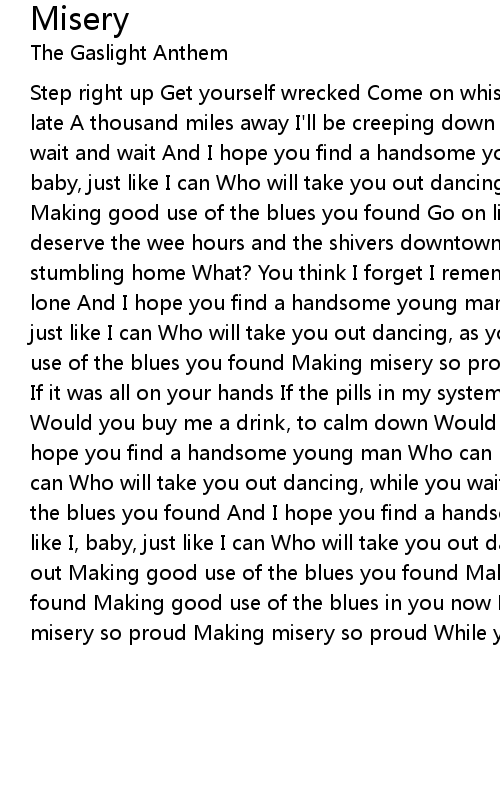 Step right up Get yourself wrecked Come on whisper my name I mean since it's so late A thousand miles away I'll be creeping down your spine And making you wait, wait and wait And I hope you find a handsome young man Who can love you like I, baby, just like I can Who will take you out dancing, while you waited me out Making good use of the blues you found Go on light it up Let your hair down You deserve the wee hours and the shivers downtown Because I'm waking up You're stumbling home What? You think I forget I remember each and every lonesome night lone And I hope you find a handsome young man Who can love you like I, baby, just like I can Who will take you out dancing, as you waited me out Making good use of the blues you found Making misery so proud And if I saw this much blood If it was all on your hands If the pills in my system came to call you up again Would you buy me a drink, to calm down Would you buy me a drink right now? And I hope you find a handsome young man Who can love you like I, baby, just like I can Who will take you out dancing, while you waited me out Making good use of the blues you found And I hope you find a handsome young man Who can love you like I, baby, just like I can Who will take you out dancing, while you waited me out Making good use of the blues you found Making good use of the blues you found Making good use of the blues in you now Making misery so proud Making misery so proud Making misery so proud While you waited me out |